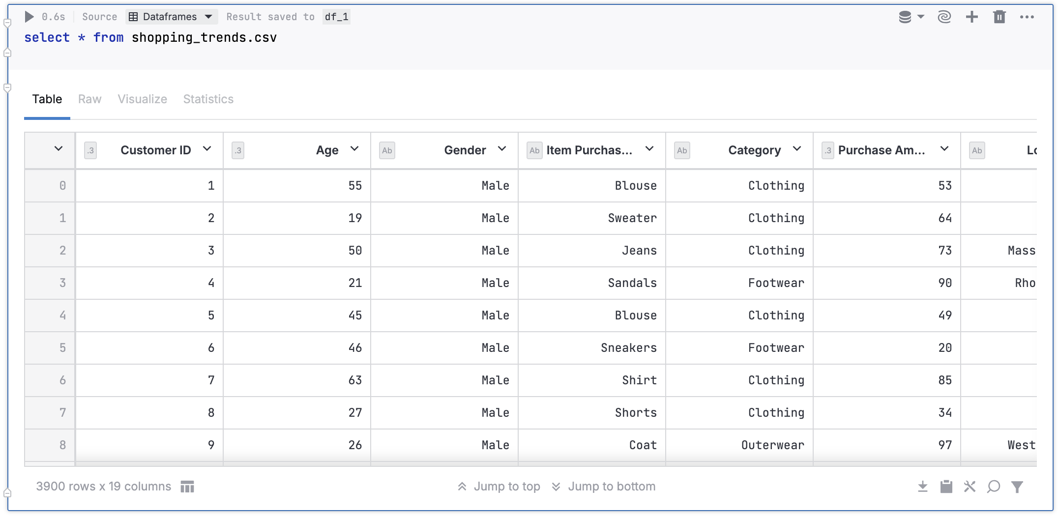 import pandas as pd my_table = pd.read_csv('shopping_trends.csv') my_table