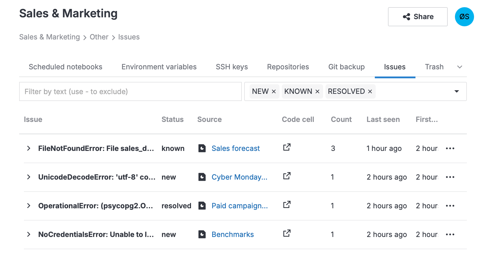 Unlike notebooks, reports run code “behind the scenes” and hide technical details from viewers, so identifying and fixing issues in reports can be difficult. The Issue center displays errors from all reports in a workspace in one place, where you can search, filter, and resolve them with ease.