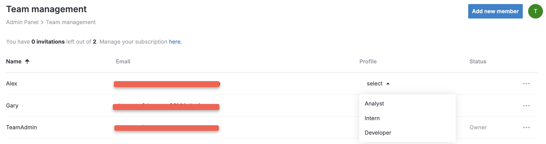 On the list of team members, expand the list in the Profile column for the user you want to assign a profile.
