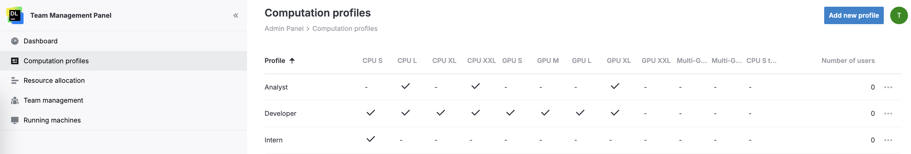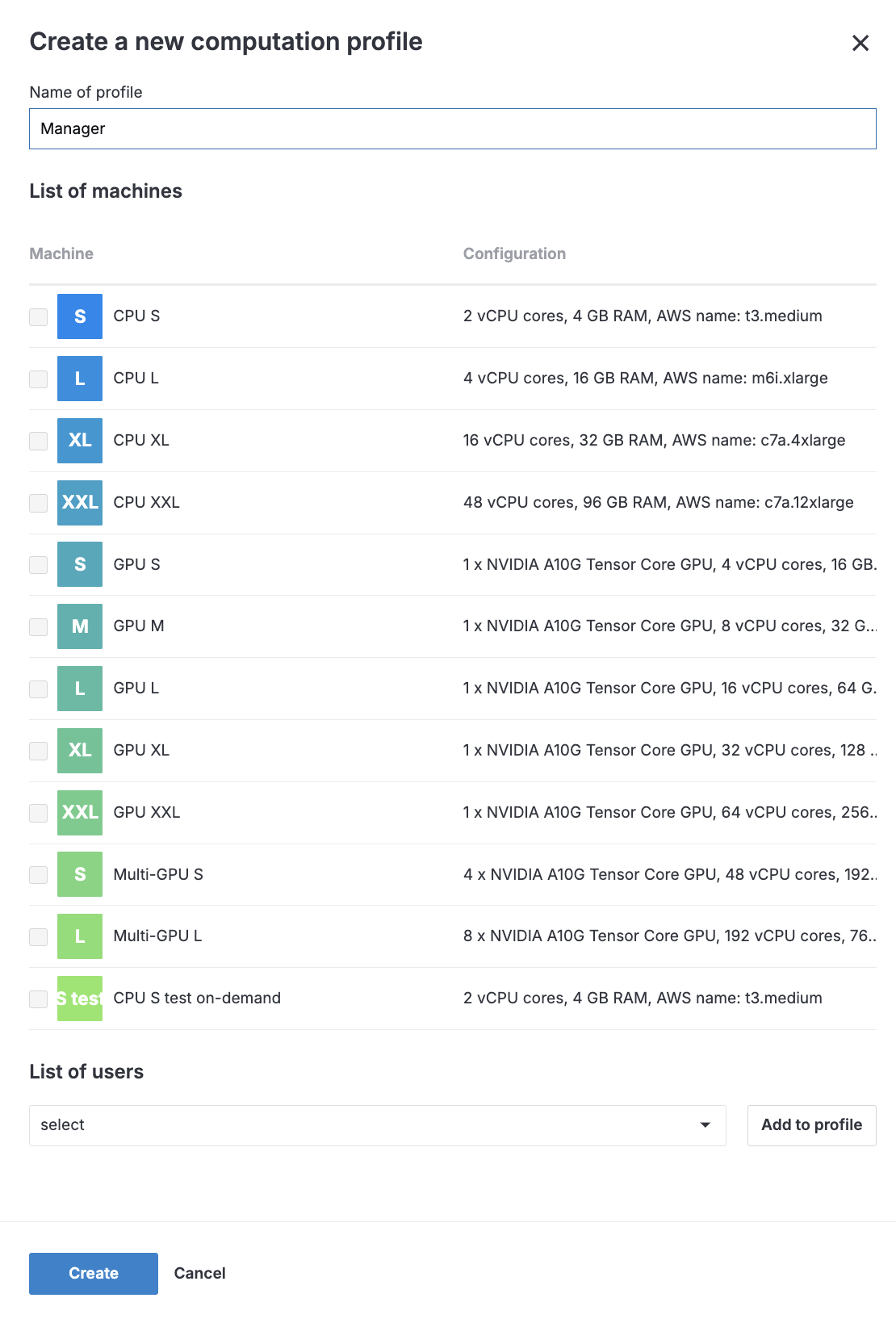 Use computation profiles to restrict access to machines for different members of your team. By assigning a profile to a team member, you allow that user to use only those machines available under the selected profile.