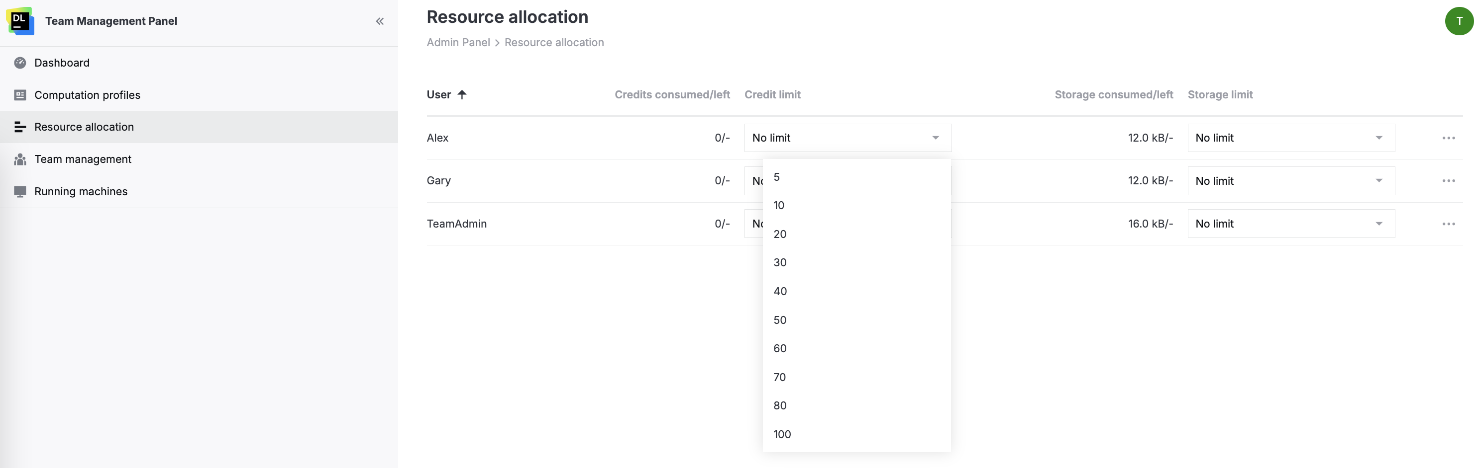 You can limit the use of Datalore credits and storage space for selected team members.