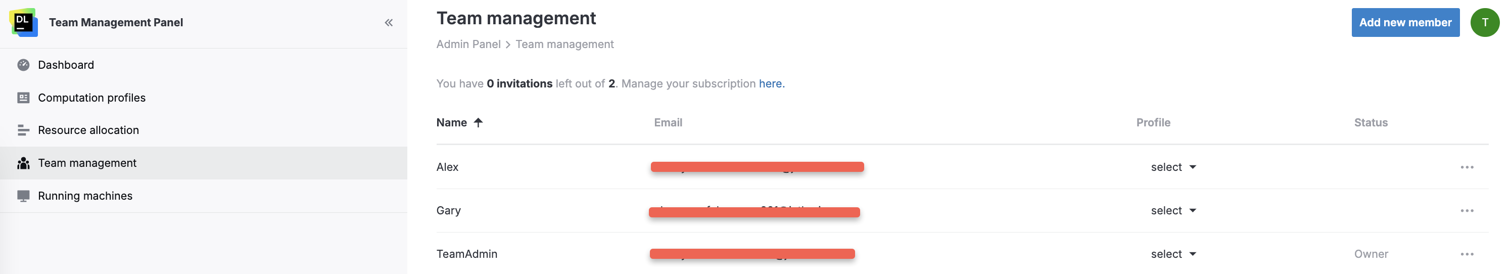 As the admin of your team, you can monitor and manage all running machines launched by the members of your team.