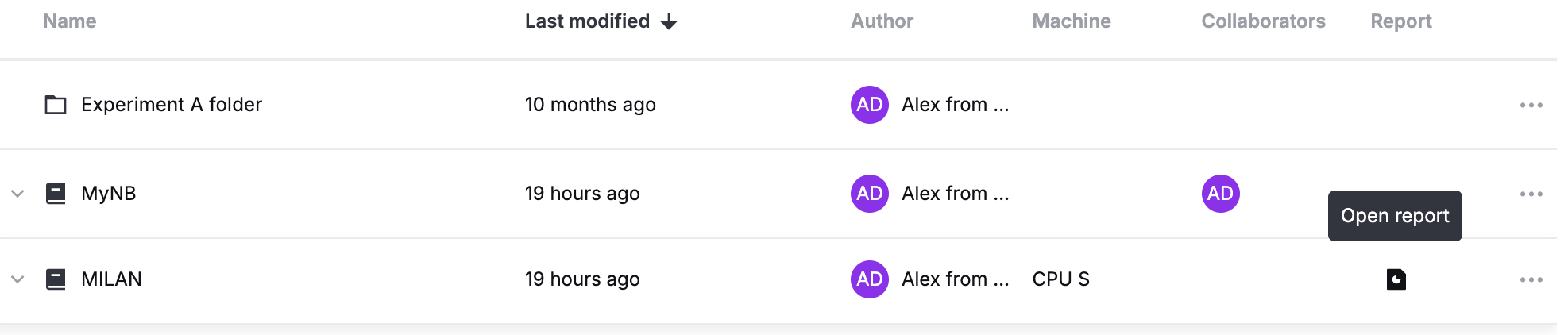 Notebooks menu, click the Open report icon in the Report column. This icon is only available for notebooks that are published as reports.