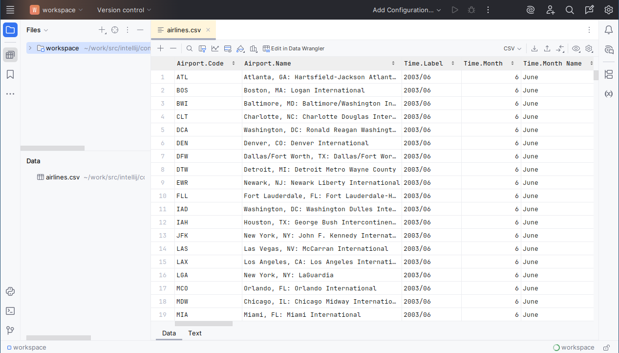 4. Now airlines.csv is shown in the Data tool window. Double-click the file to open it in the editor: