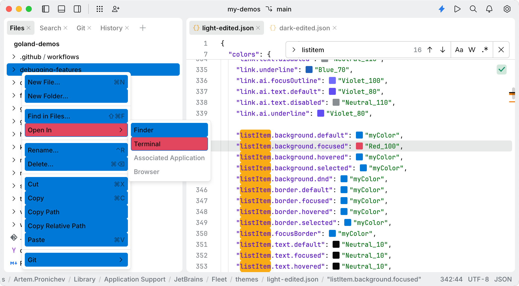listItem.*: thelistItem.*keys now control the style of list items across all UI elements, including context menus and completion popups. The following keys are deprecated:editor.interline.listItem.*popup.listItem.*