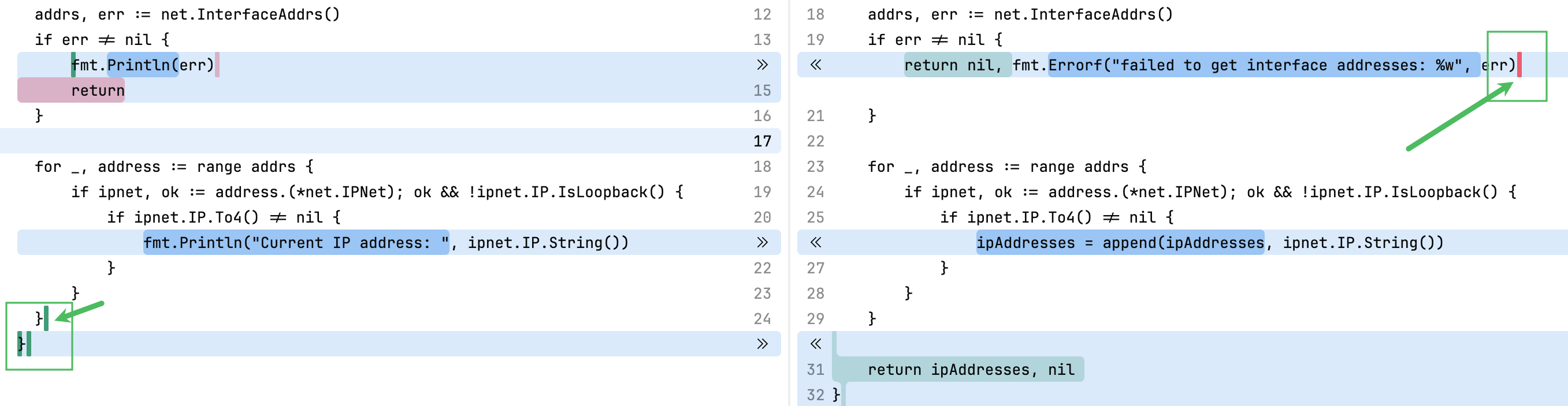 Locations where new code is added or deleted are indicated by colored vertical dashes: