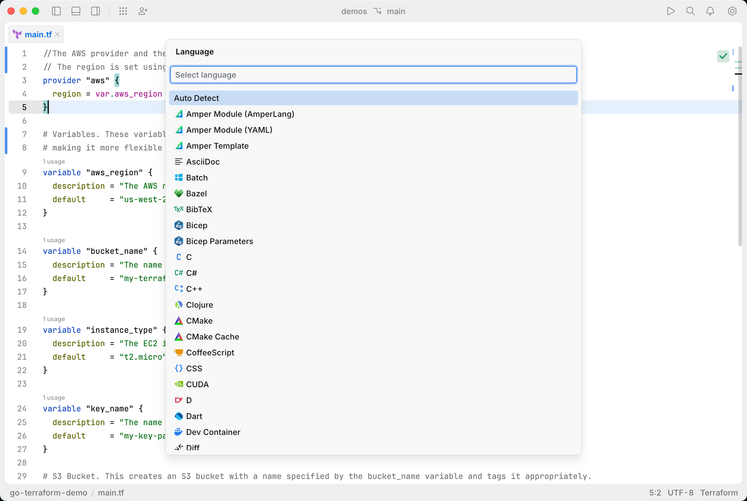 While working on a file, JetBrains Fleet automatically detects its format, which determines the behavior of code intelligence features.