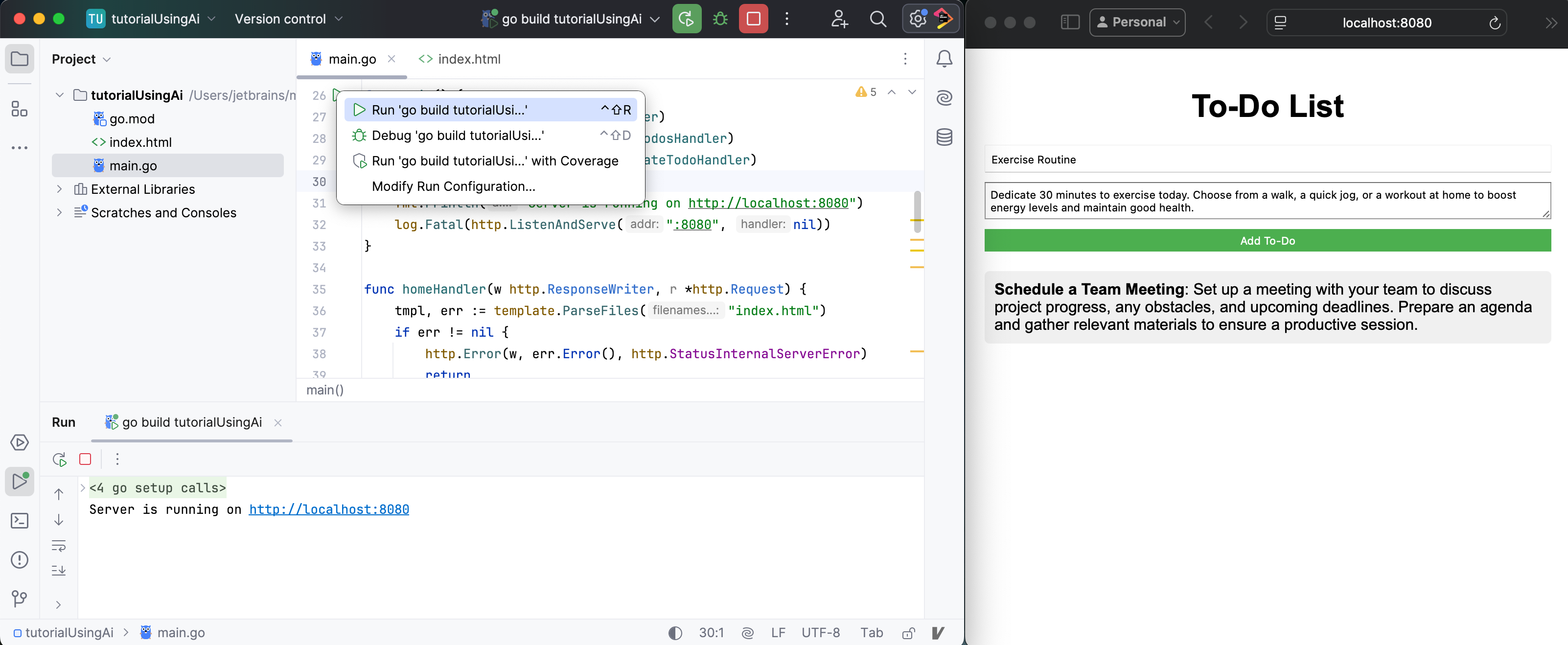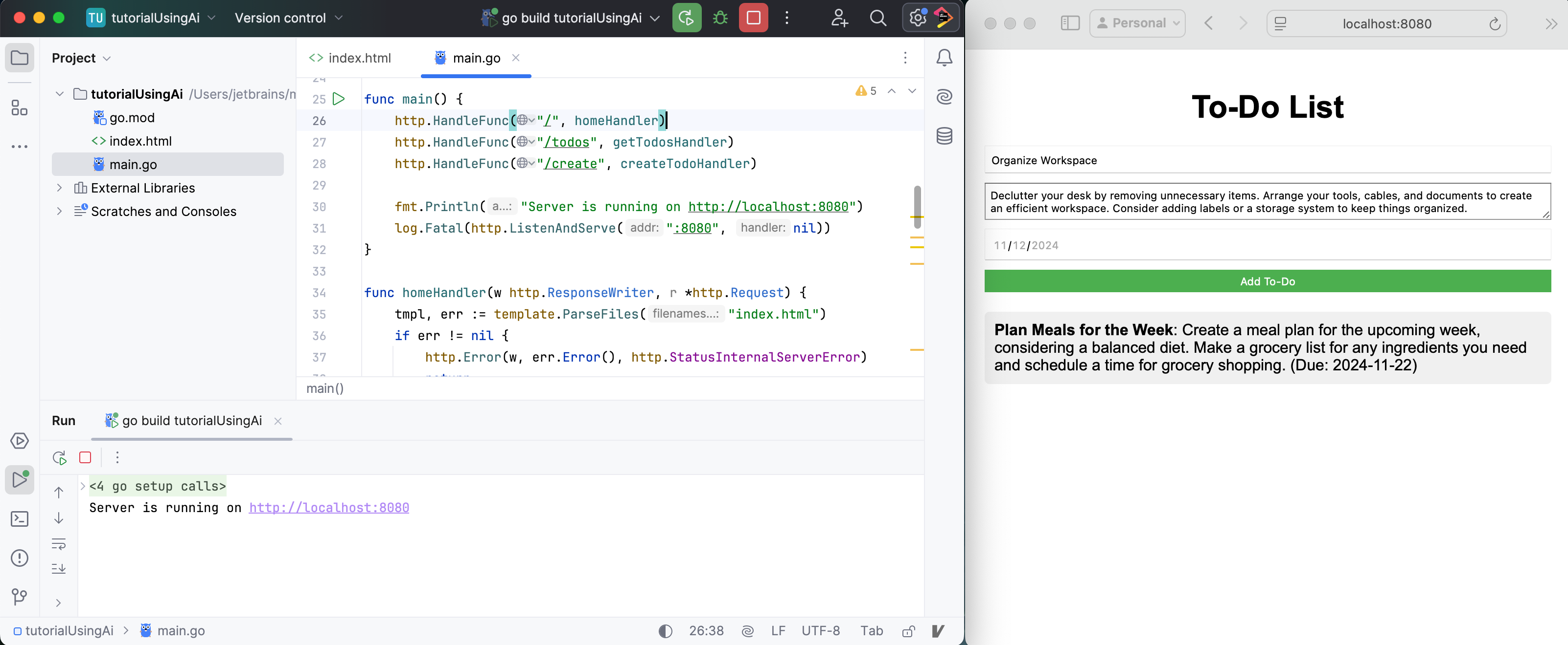 This tutorial demonstrates how to use the AI Assistant in GoLand to build a web application from scratch. It covers project creation, generating an application with AI-driven suggestions, running and testing the application, modifying and enhancing its functionality, and finally managing it with version control.
