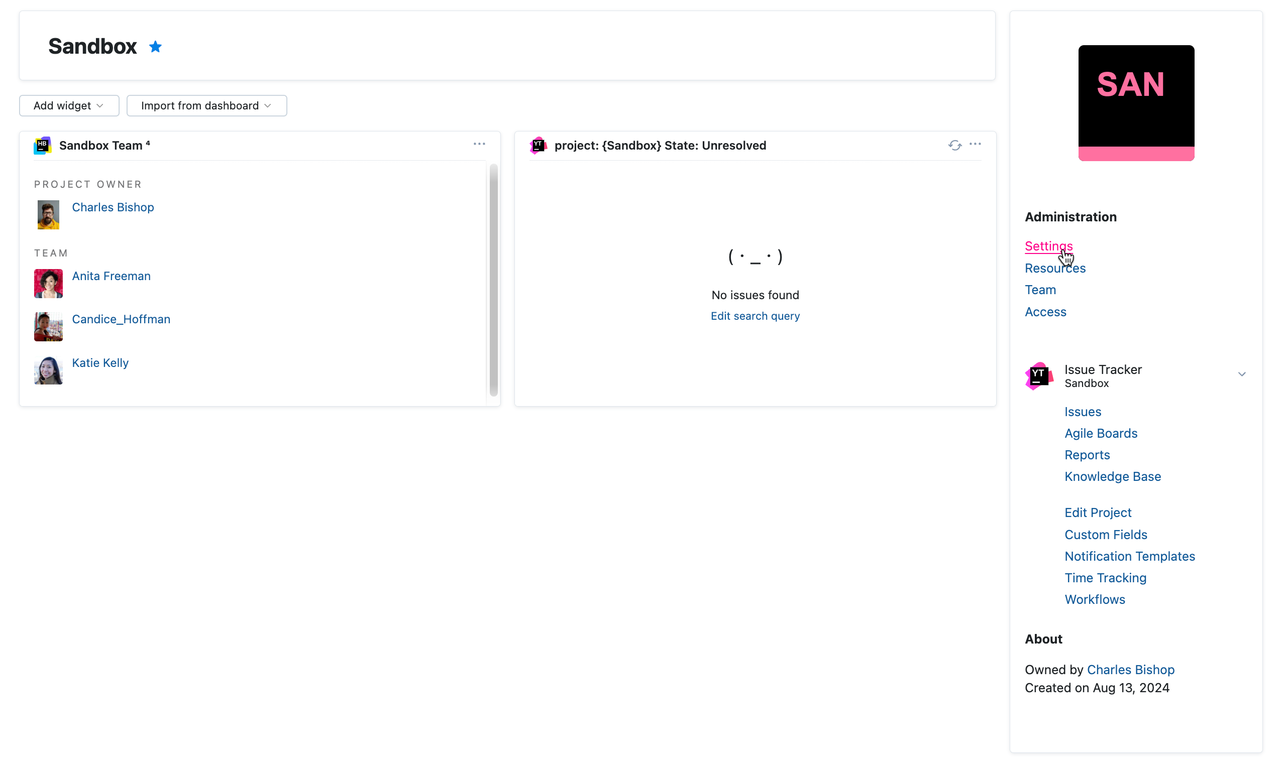Open the project overview page and click the Settings link in the Administration section of the sidebar.