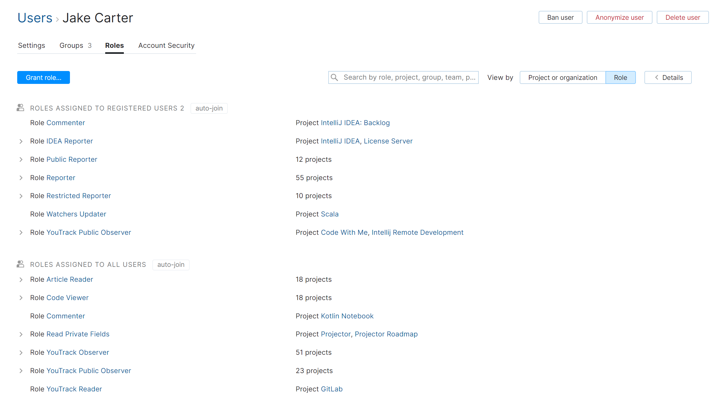 There are two views available on this tab. The default view shows the list of roles that are assigned to the user, listed by Project or organization.