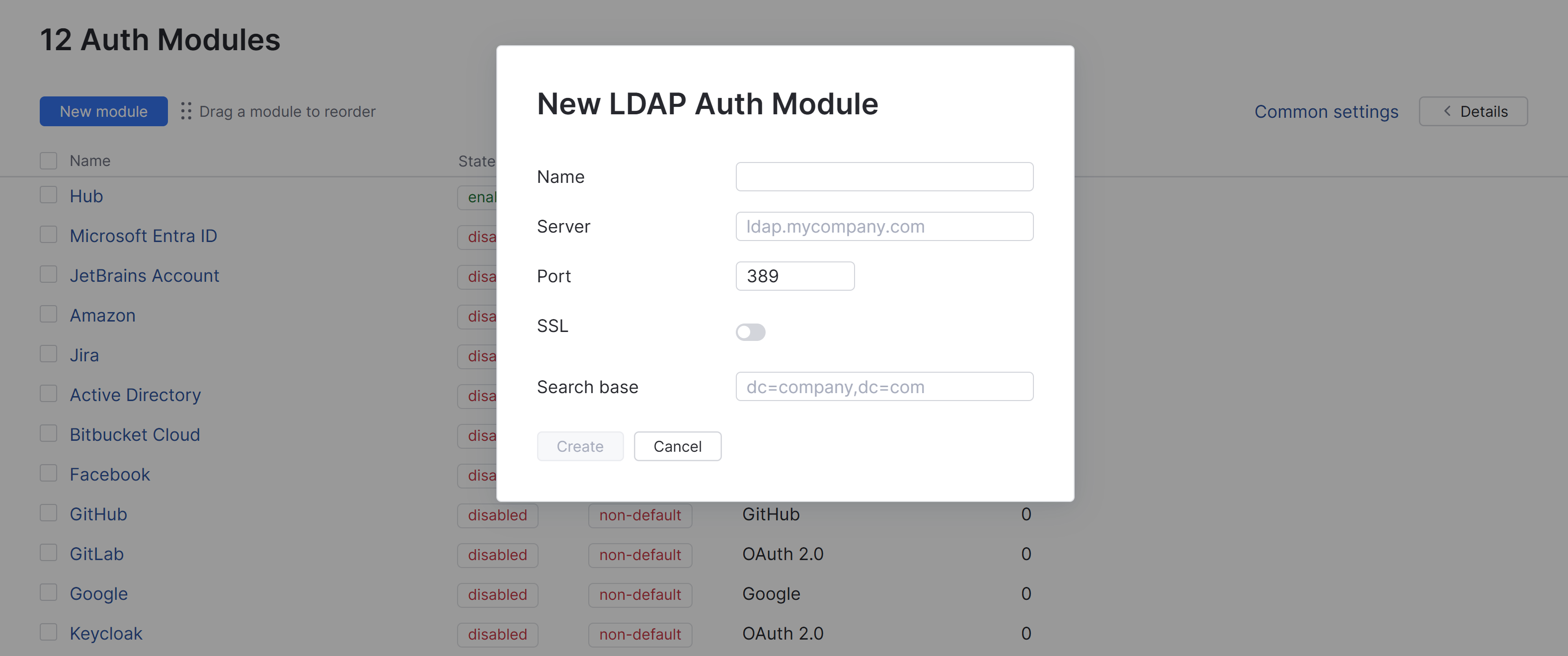 The LDAP authentication module is created. The current status of the module is displayed next to the name of the module in the header.