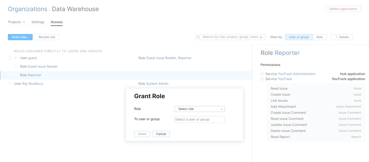 Before you start granting access rights in an organization, consider reviewing the list of roles to make sure you know which role will give you the desired level of access. You also might consider creating and assigning users to groups so you can distinguish between sets of users who have different access requirements.