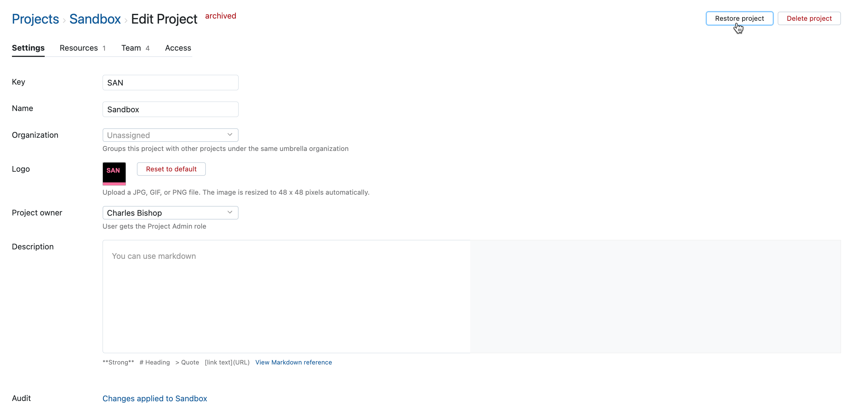 Click the project link in the Archived section at the bottom of the list and select the project to restore.