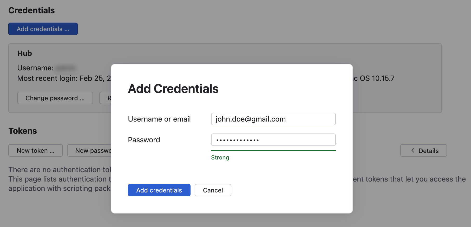 You can use any set of credentials as a Hub login. If you prefer to use a username and password that is not already saved as your primary login for Hub, you can add them as a new set of credentials.