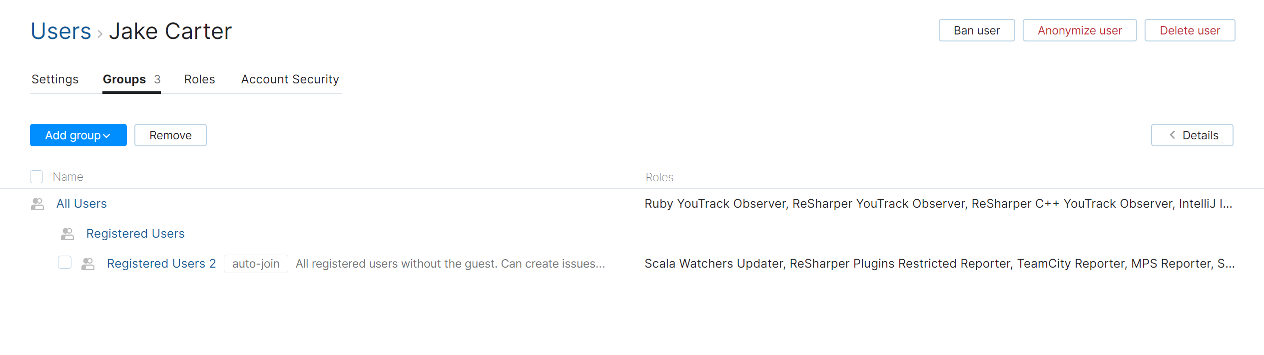 To view and configure group membership for a user account, open the Groups tab of the account profile.