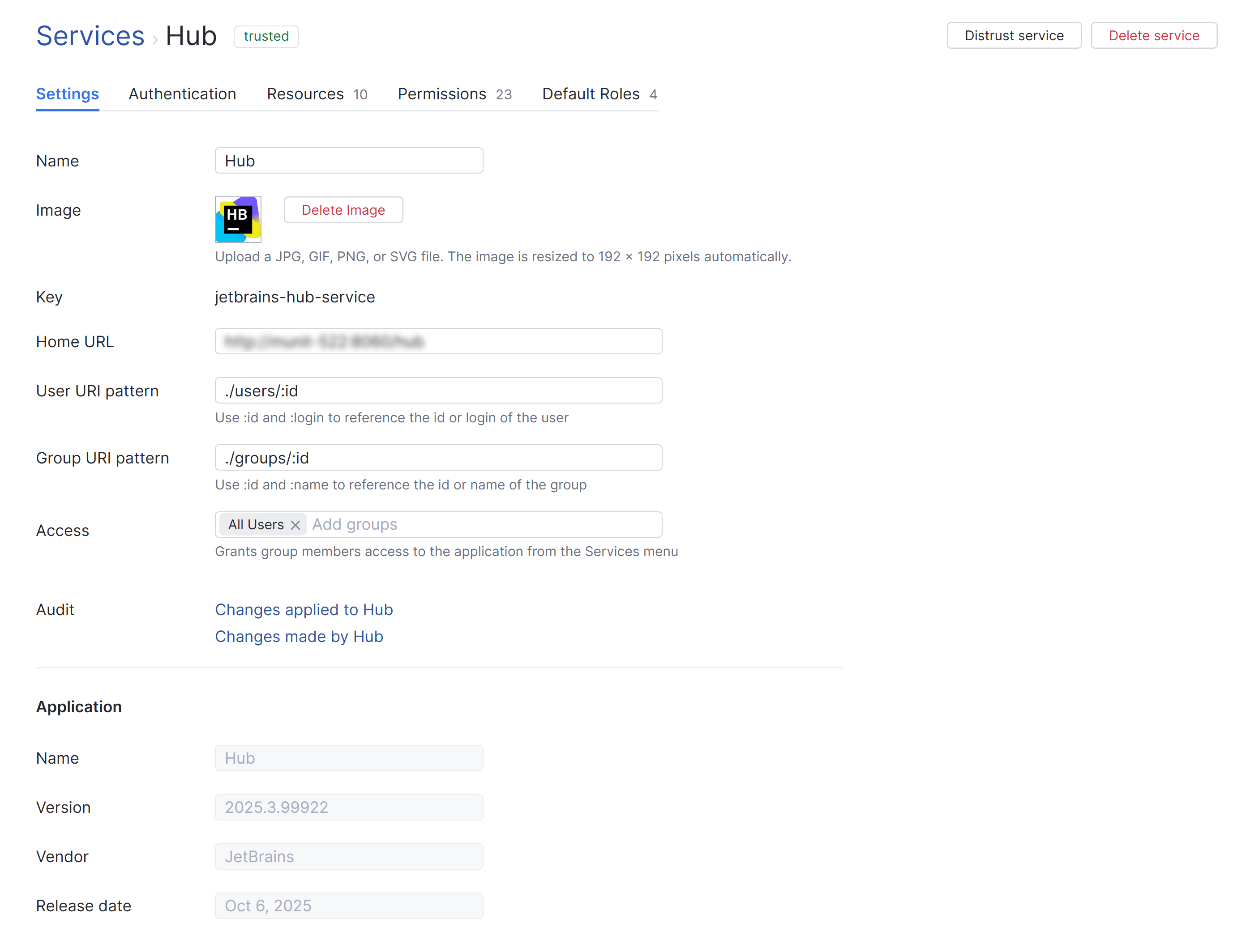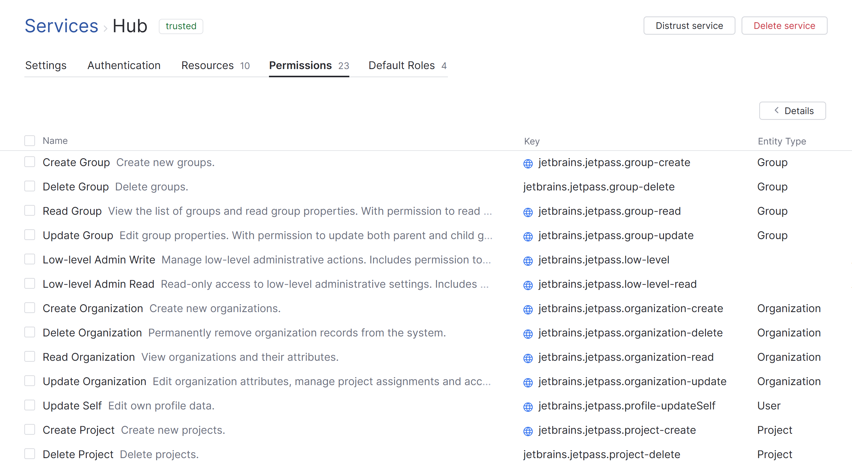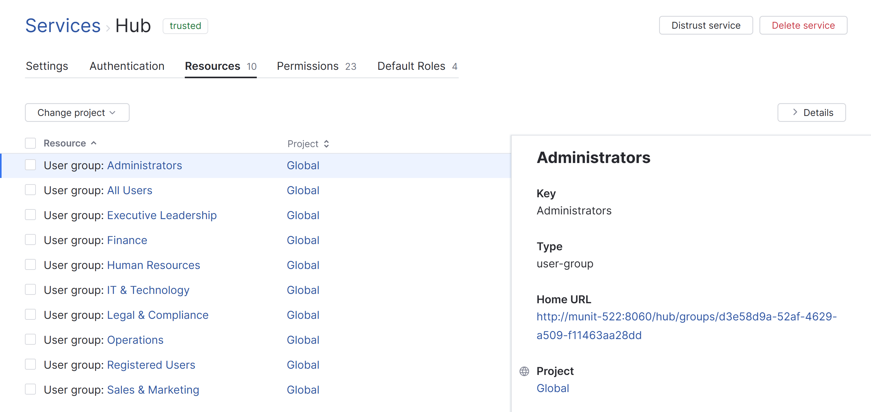 The Resources tab displays a list of resources that are available in the selected service. The type of resource varies by service. For example, a YouTrack service displays a list of projects in YouTrack. A Hub service displays a list of user groups.