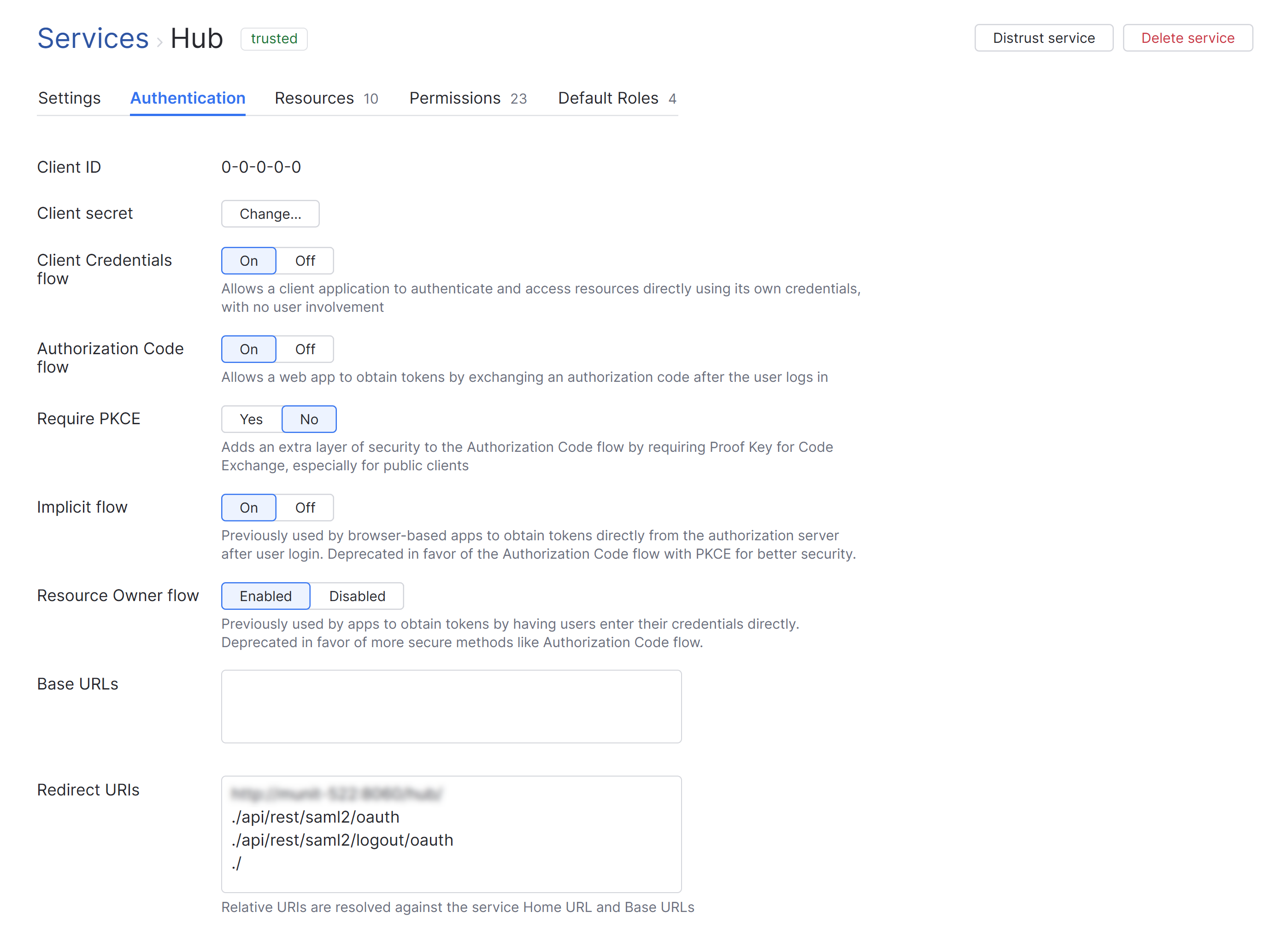 The Authentication tab displays settings that let you define which OAuth flows are allowed for the selected service.
