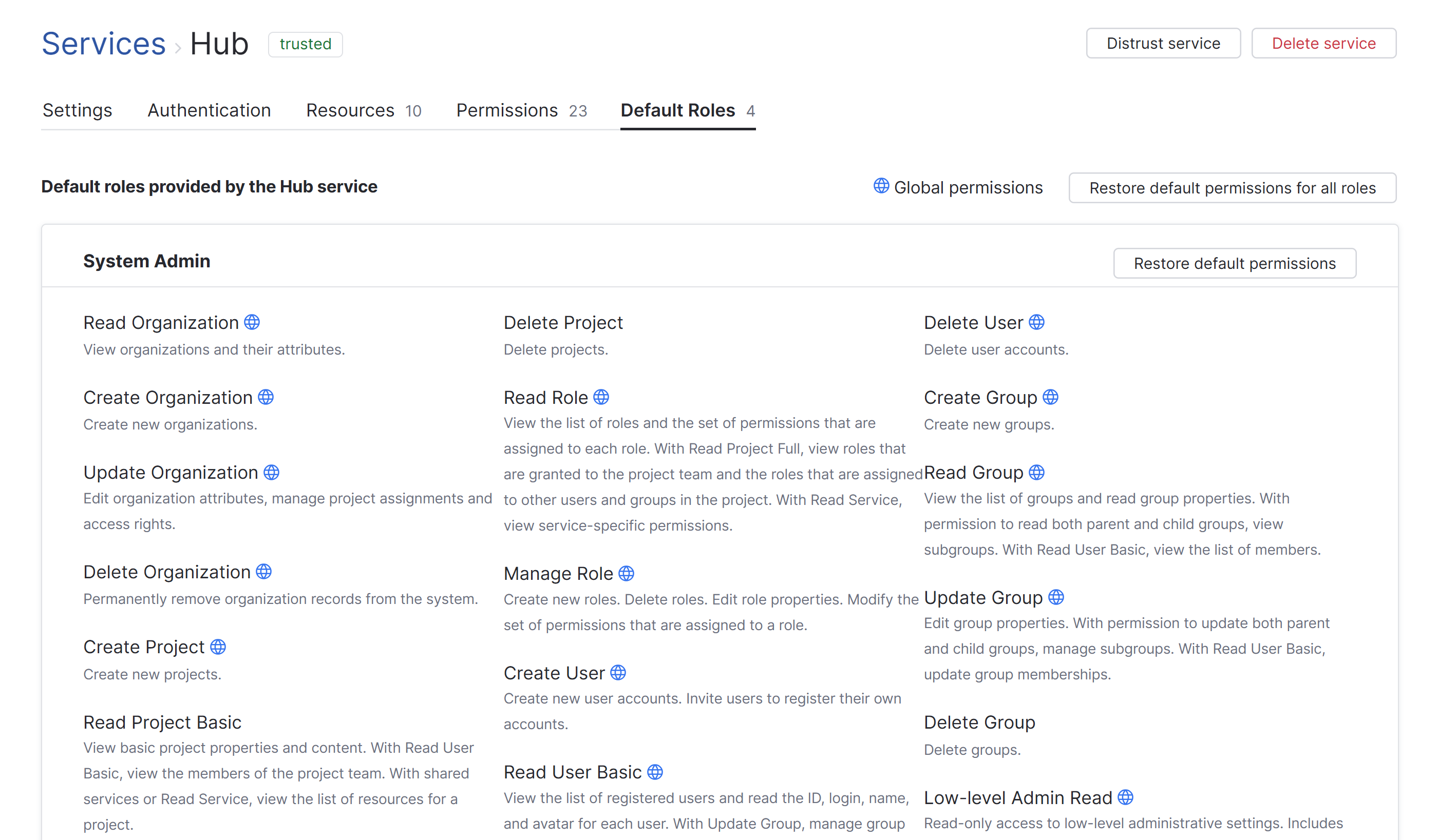 The Default Roles tab displays a list of default roles that are defined in the selected service. Each default role is listed on the page with a list of the permissions that are currently assigned to the role.
