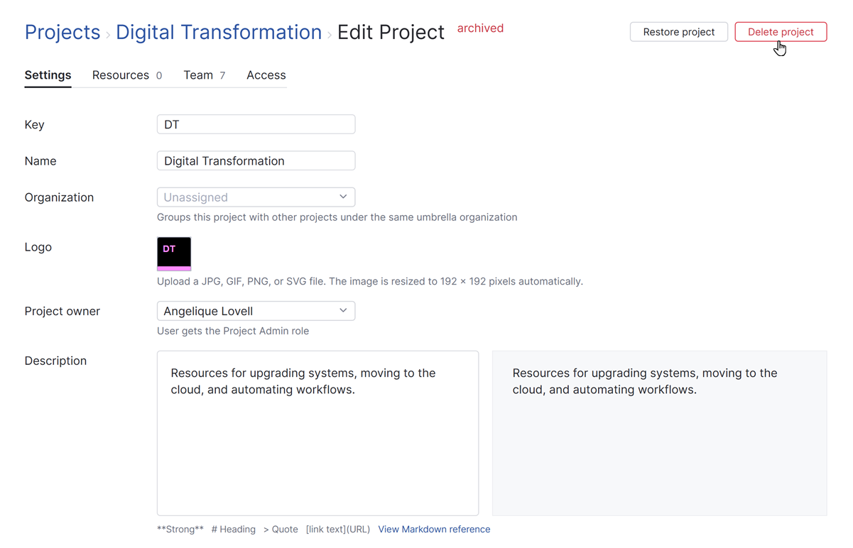 If you have a project that is no longer actively managed, you can delete it from Hub. When you delete a project, you are asked to select a successor. The successor project inherits all the resources that are used in the delete project. If you want to delete the resources that are used by the deleted project, you need to delete them directly in the connected service.