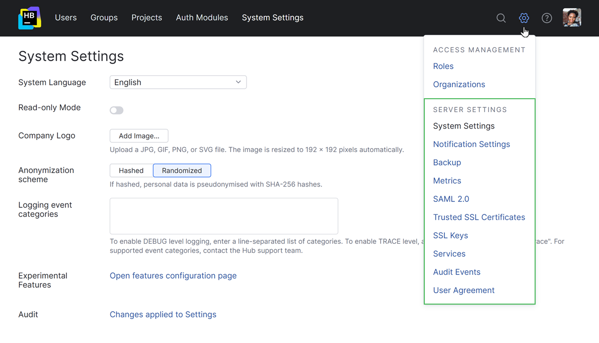 The topics in this section of the documentation provide instructions for managing the settings of your Hub server as an administrator. The options described here are available from the Server Settings section of the Administration menu.