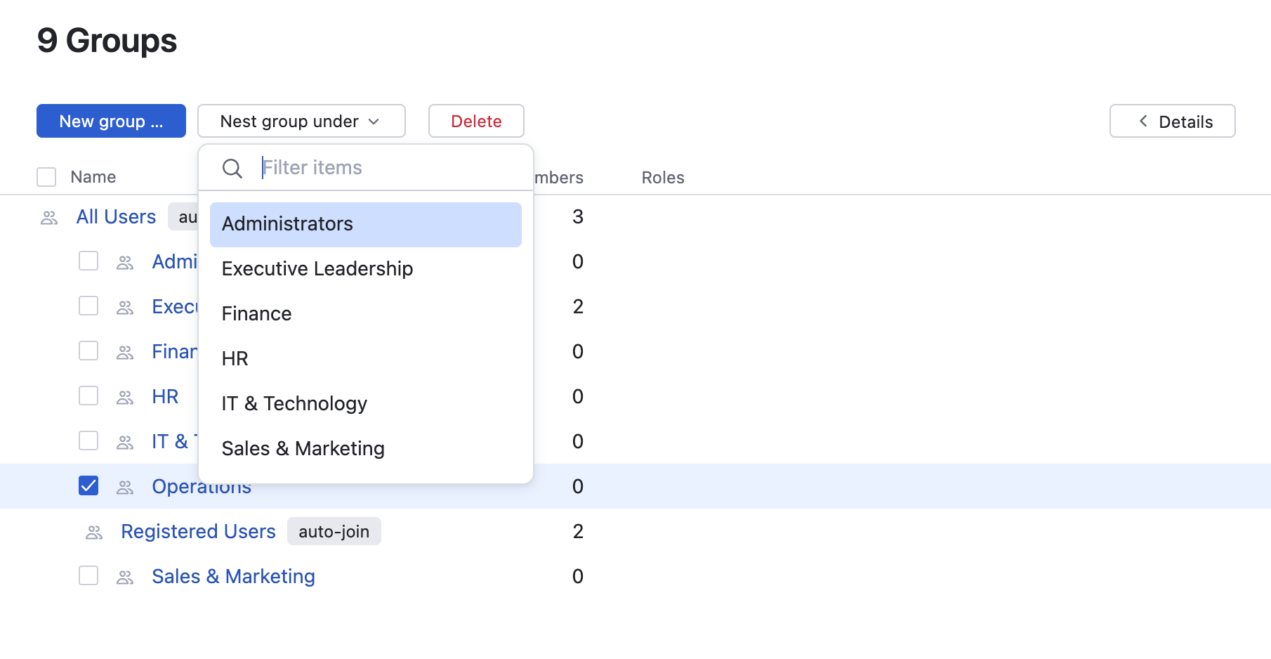 If you ever want to reverse this operation, just select the nested group in the list and nest it under the All Users group instead.