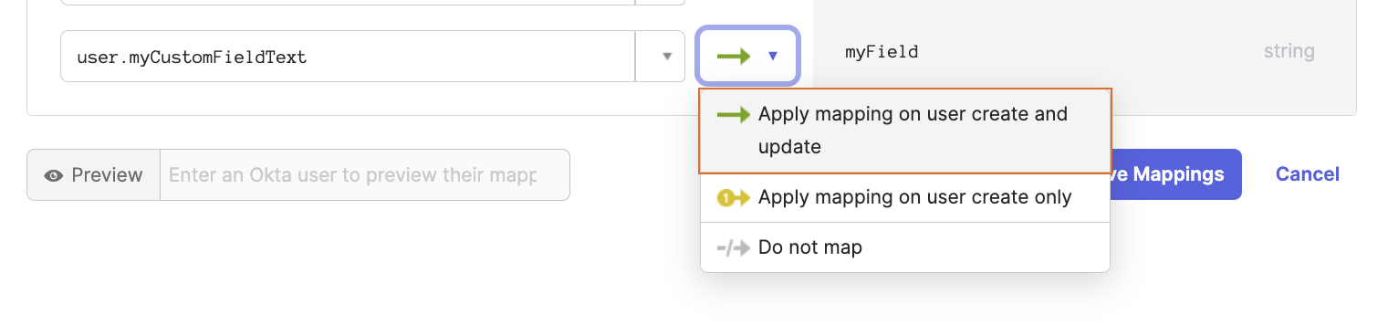 When a user profile response object is returned by Okta, values from the specified field paths are copied to the user profile in Hub. Use the settings in the Field Mapping section of the page to define the endpoint that locates profile data for the authenticated user and map fields that are stored in the authorization service to user accounts in Hub.