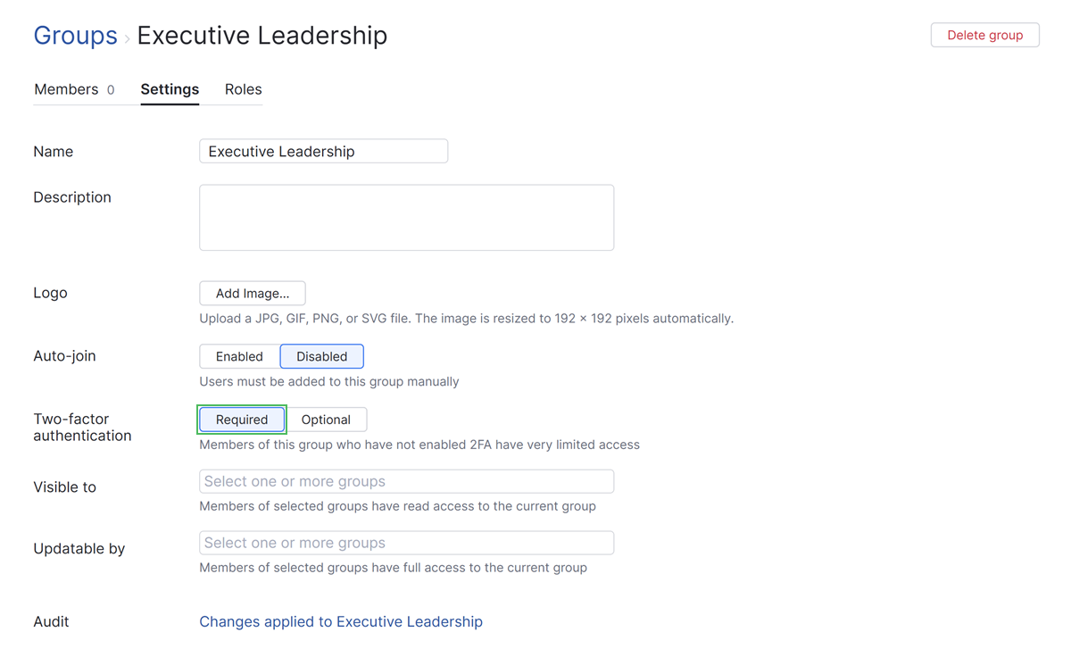 The Two-factor authentication setting in the group profile lets administrators require two-factor authentication (2FA) for any group in Hub.