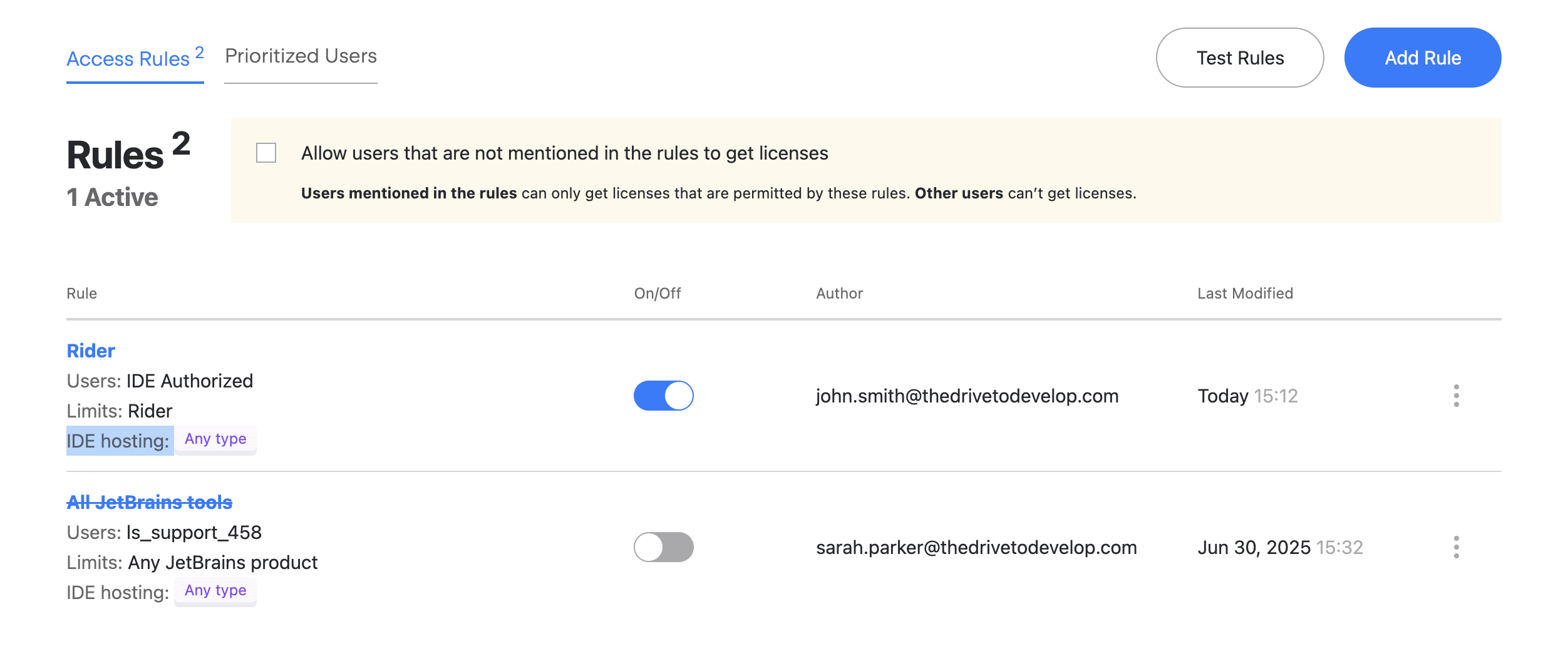 Access rules and priorities help you control access to licenses in your organization. You can limit access to specific users or profiles, decide which product licenses they can get, and set the required IDE hosting type.