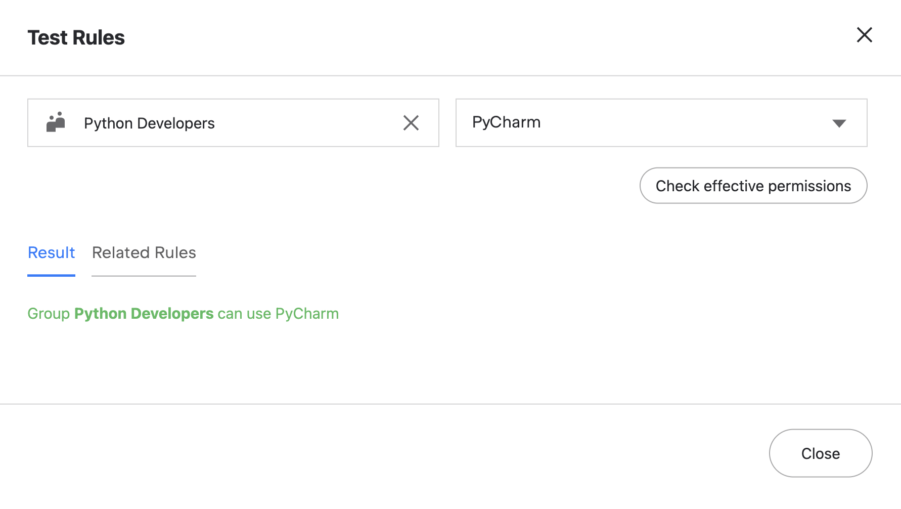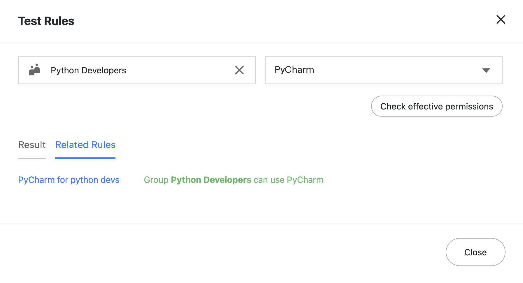 Going back to the example with a single rule that gives Sarah access to PyCharm, here's what will change: