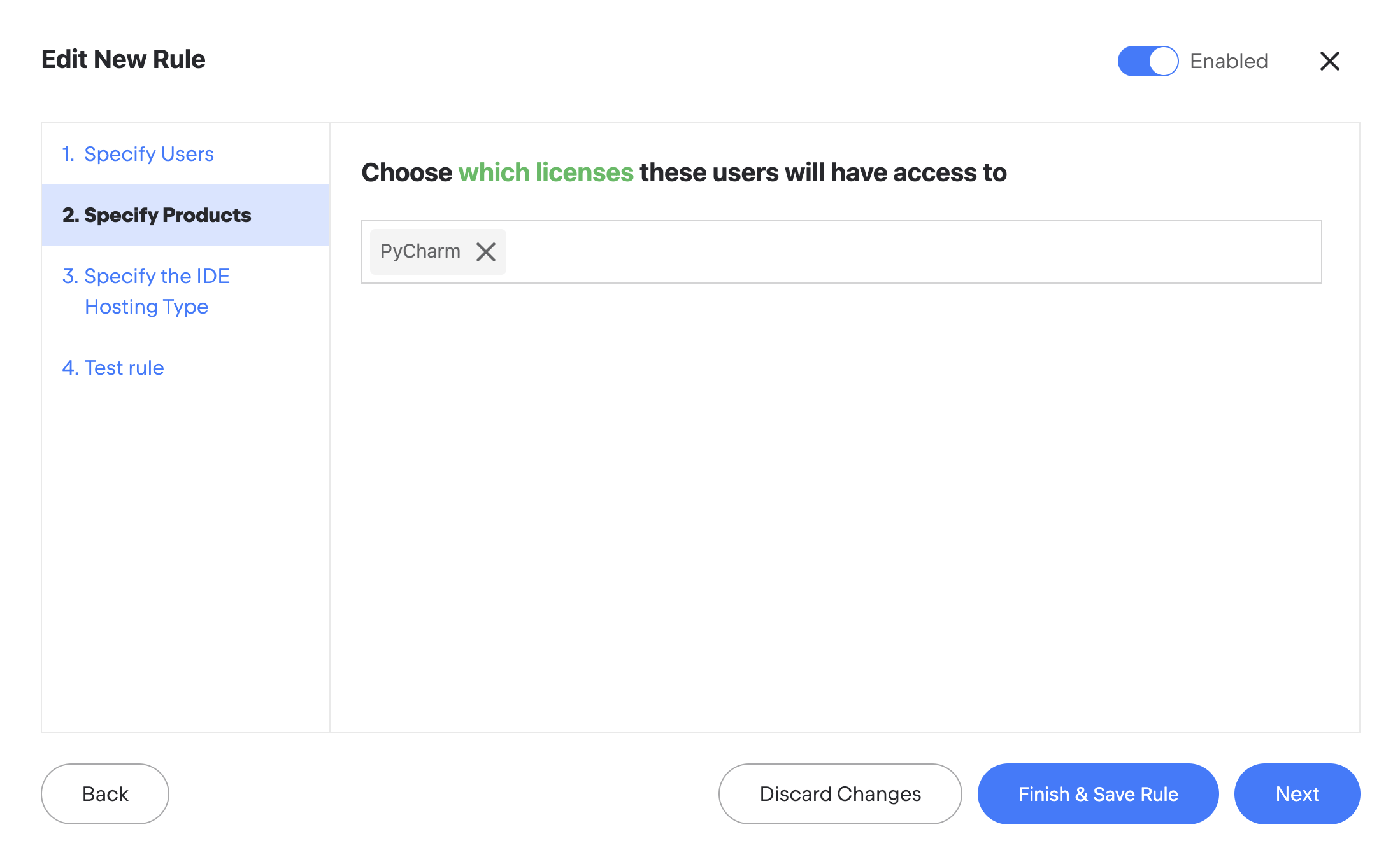 If multiple rules apply to a user, this user can access licenses for all products included in those rules. For example, if one rule lets Sarah use PyCharm and another lets her use CLion, she’ll be able to get licenses for both.