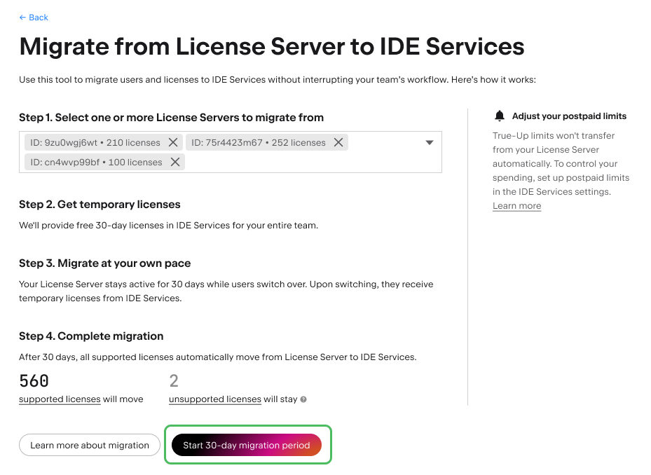 If you have been using the True-Up option for your License Server, True-Up limits won't be transferred to IDE Services automatically during migration. You can set up postpaid license limits in the IDE Services settings if necessary.