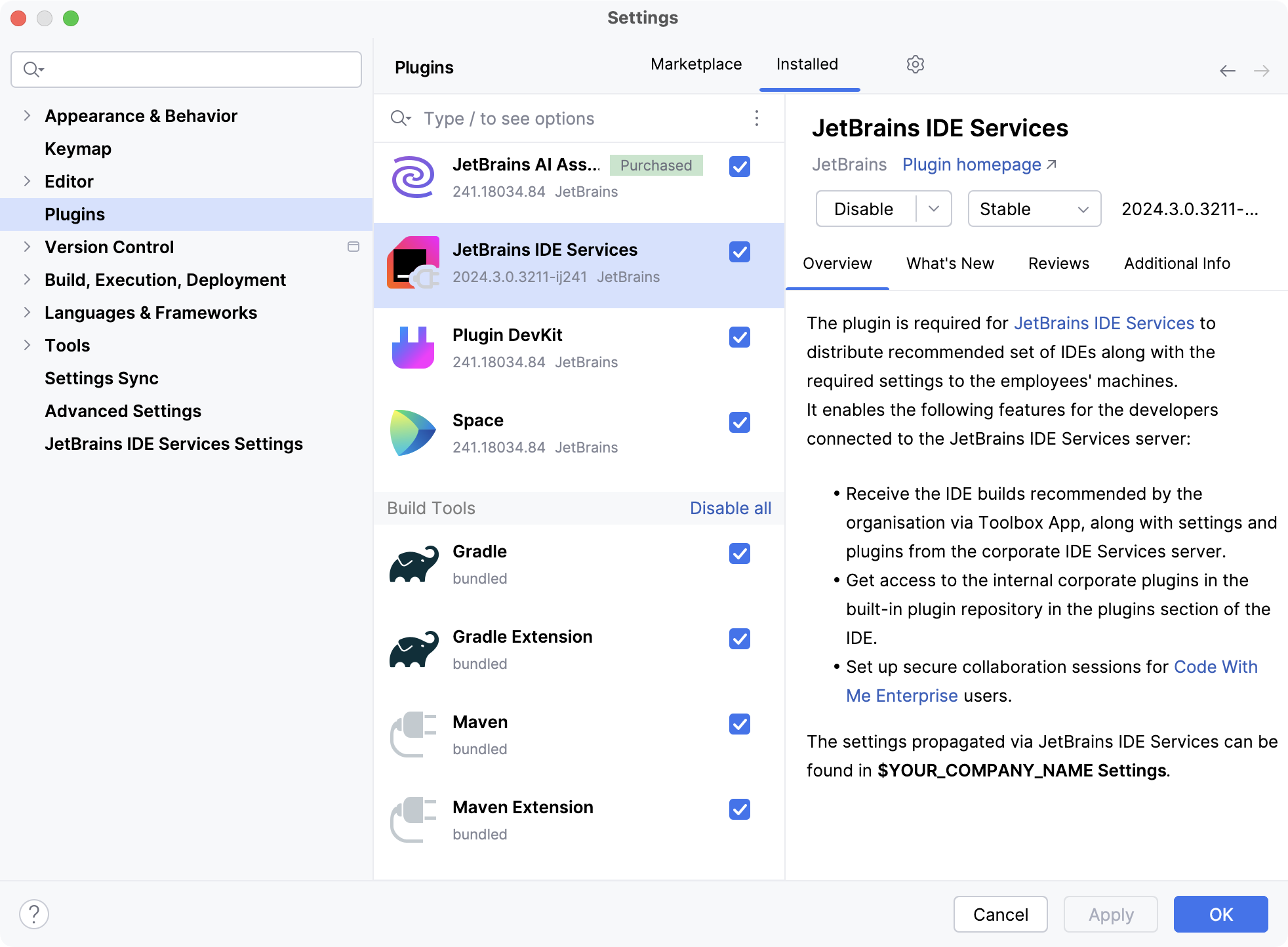 IDE Services delivers pre-configured settings, plugins, and VM options directly to your workspace. You can explore the list of propagated configurations in your IDE's settings: .