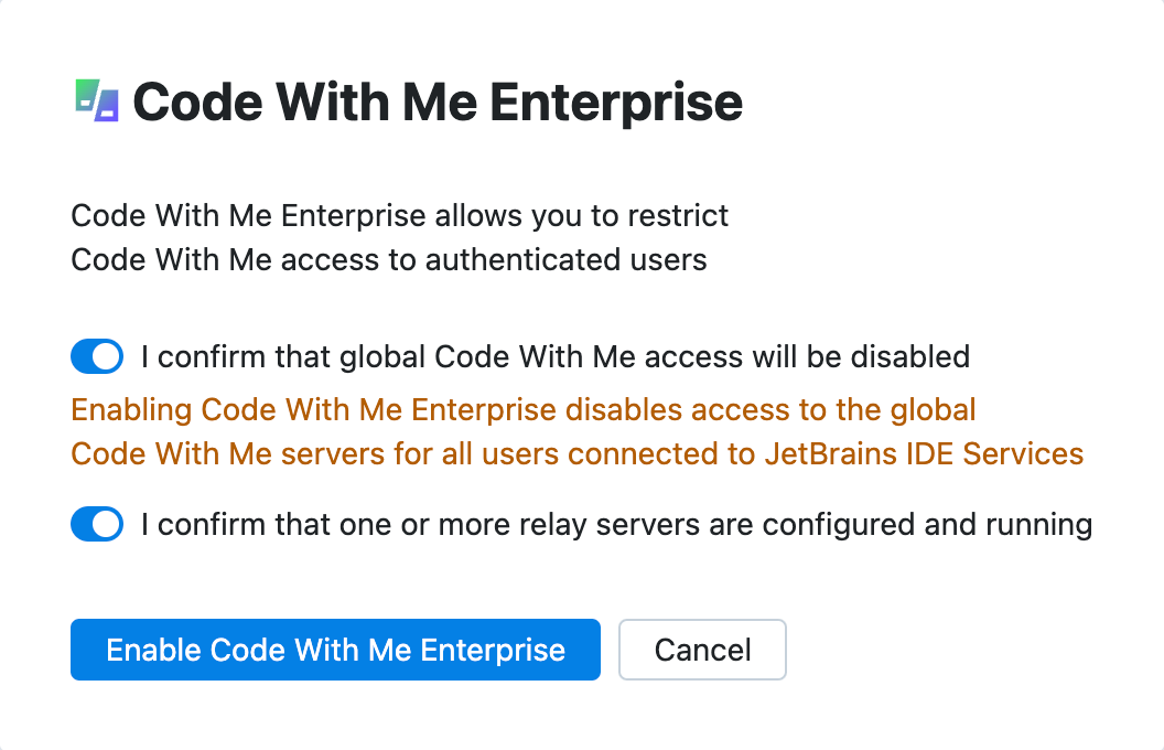 4. In the Code With Me Enterprise dialog, enable the following options: