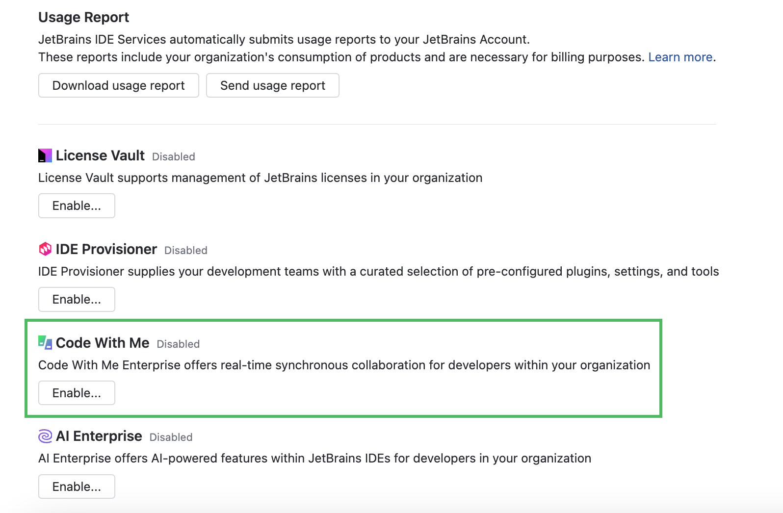 If you use the prepaid billing model, you'll see the preconfigured usage limits for Code With Me Enterprise.