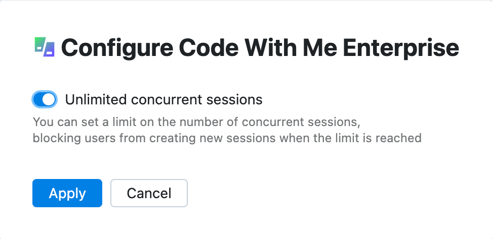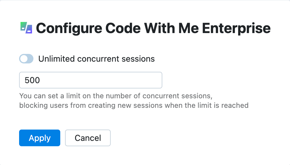 In the Configure Code With Me Enterprise dialog, configure the limits for Code With Me Enterprise.