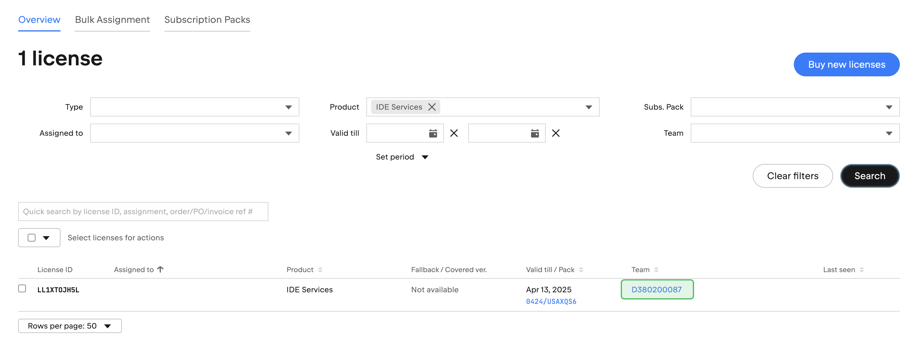 5. Once you locate the IDE Services license in the license table, check the penultimate column of the table to find the name of the team to which the license belongs. That's your IDE Services team.