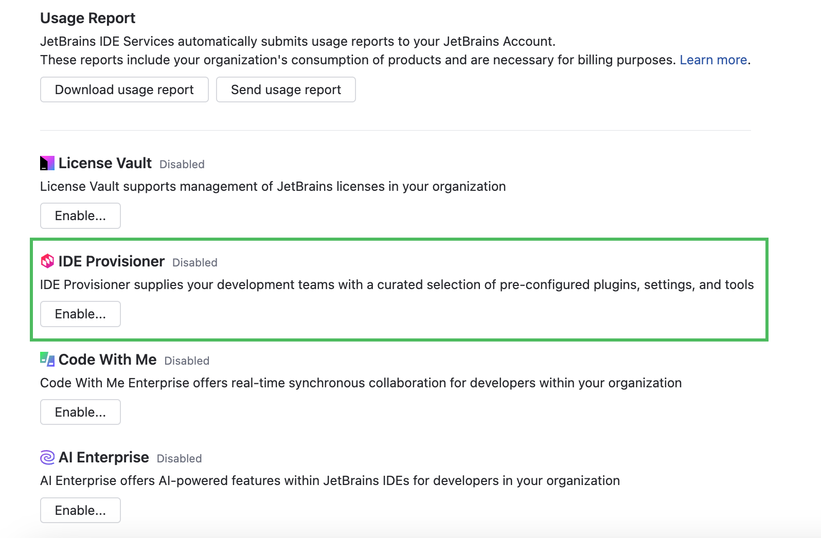 To enable delivery of available IDEs and plugins to the end users via Toolbox App, you should enable IDE Provisioner on the organization level.