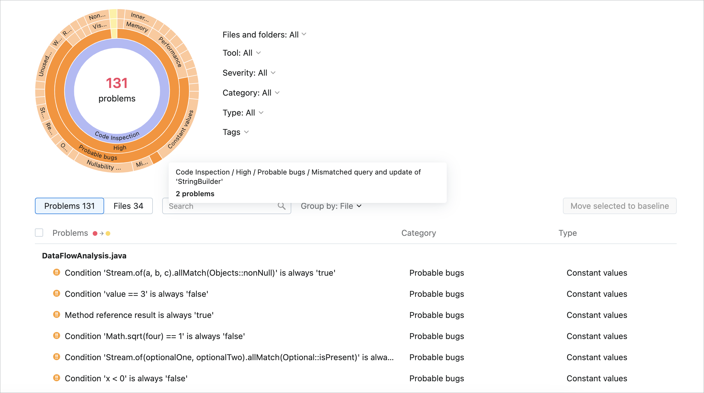 Use to filter the inspection list. For example, you can filter inspections by severity or by language.