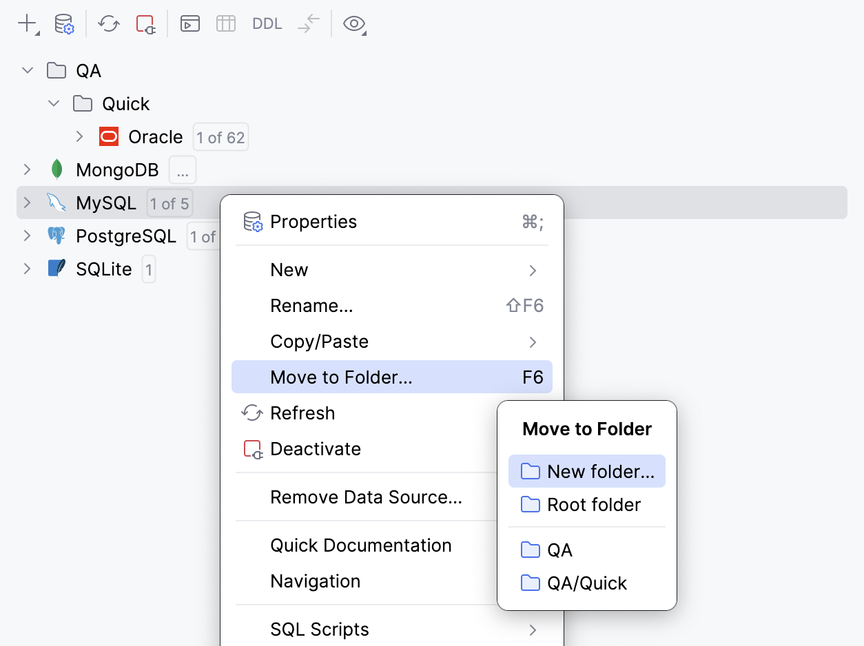 Database allows creating folders and grouping data sources in them. You can also move one folder to another and create subfolders. Folders configuration is stored in .idea/db-forest-config.xml. You can add this configuration file to the VCS to share it with your colleagues, or you can also ignore it in the VCS.