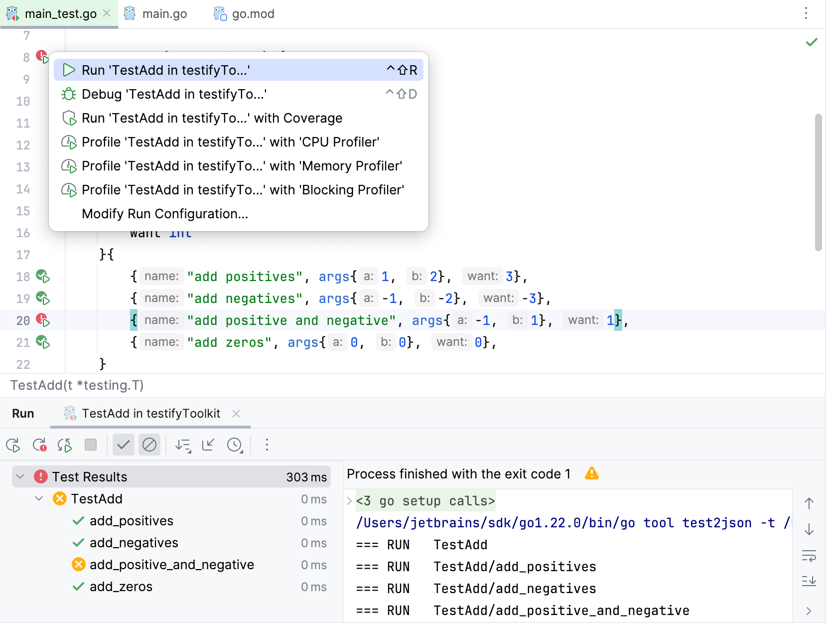 • Click the Run test icon The Run test icon and select Run <configuration>.