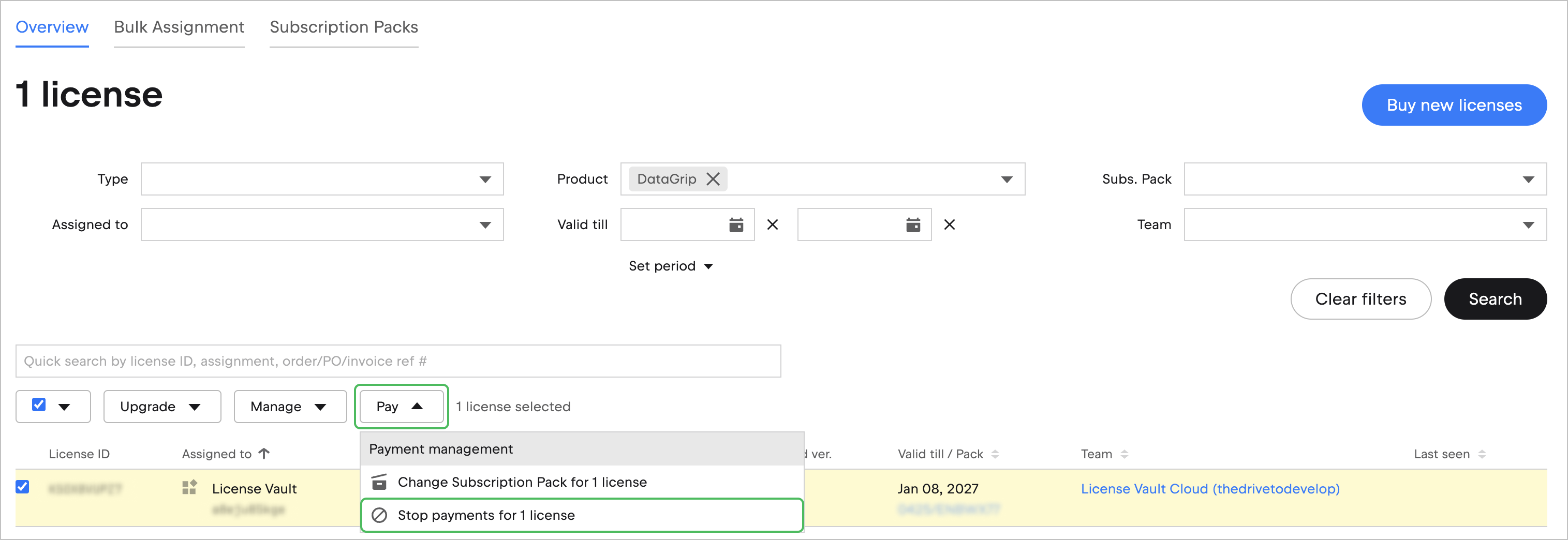 Select the subscriptions you want to cancel, click Pay, and then select Stop payments for X licenses.