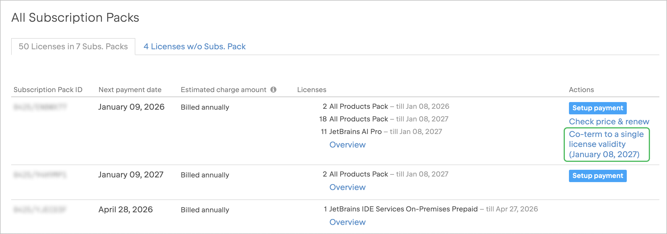The pack’s payment date is updated to match the renewal date of your subscription(s) that expire last. Their billing cycle stays the same, and there’s no extra charge to co-term them. Subscriptions that expire sooner are extended to the pack’s new payment date. You pay only for the time between their current renewal date and the new payment date, with costs adjusted accordingly.