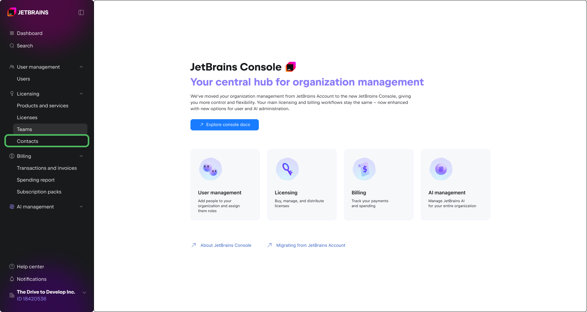 Contacts added to JetBrains Console receive notifications about the organization's JetBrains products and licenses. Depending on the role, they may also have access to certain account areas. To learn more about contact roles, see Contacts.