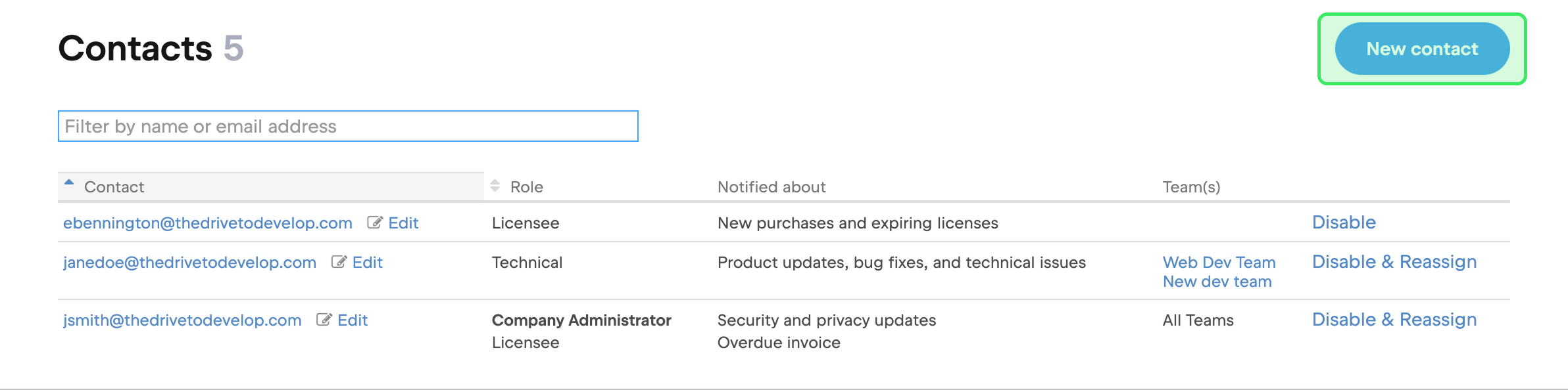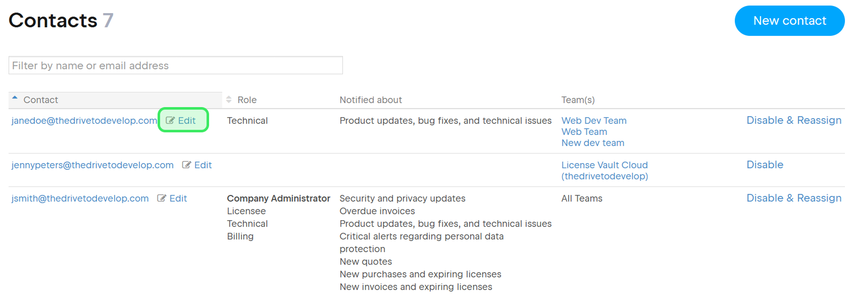 Depending on the contact’s current roles, you’ll see either a Disable or Disable & Reassign button in the last column of the contacts table. Click the button.
