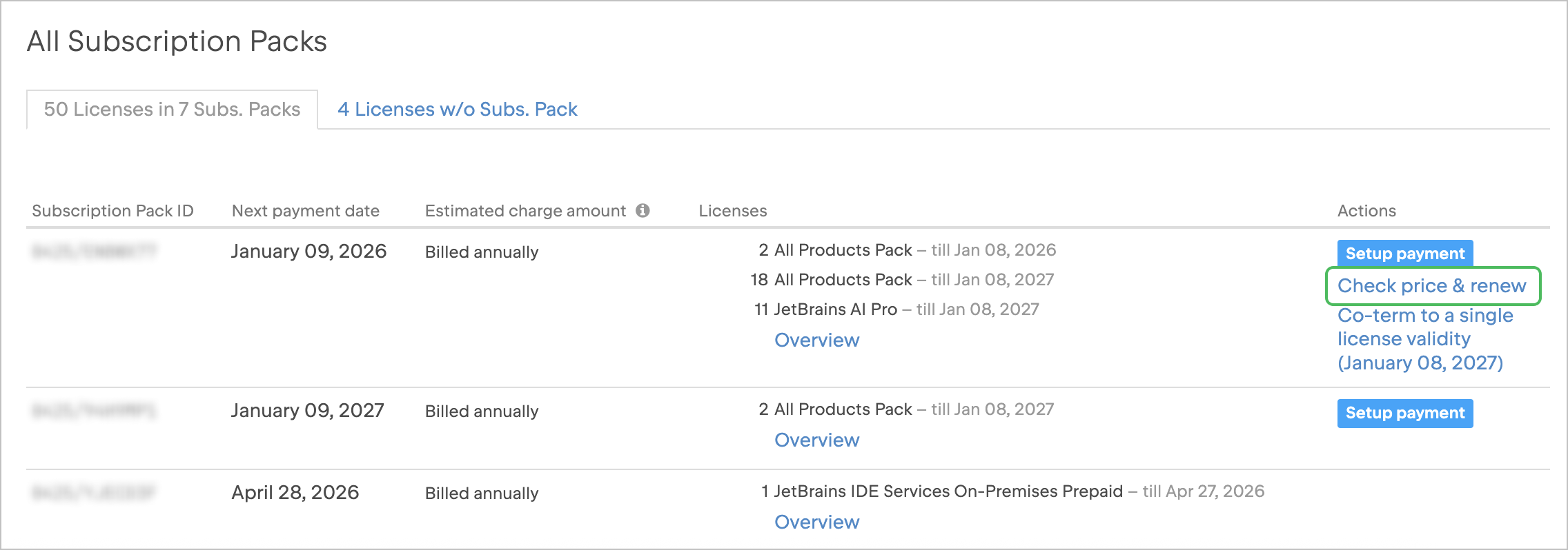 Find the subscription pack you’d like to renew and click Check price & renew.