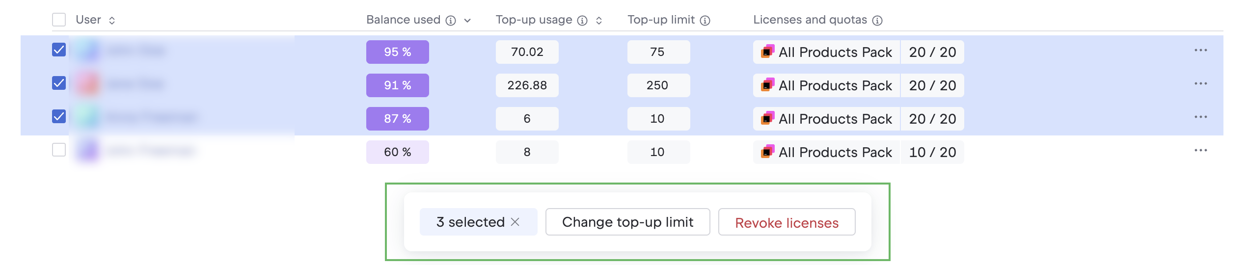 To set the same limit for multiple users, select them using checkboxes in the User column and click Change top-up limit on the toolbar below the table.