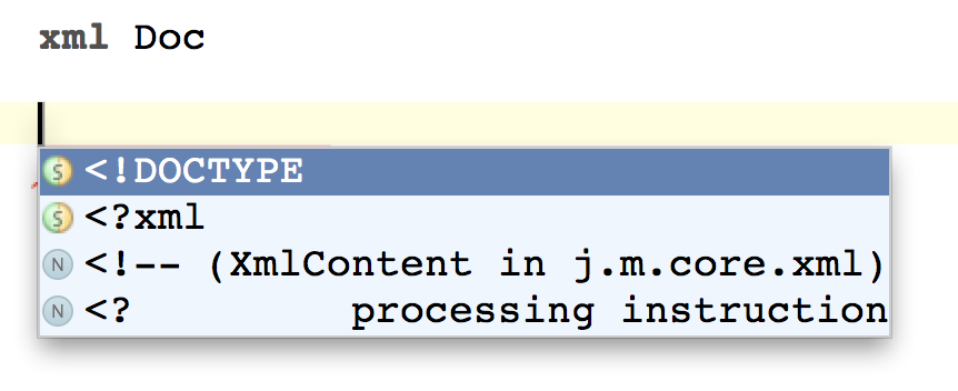The elements, their attributes and values can then be entered naturally. The XML-specific symbols, such as e.g. '<', '>', '=', 'space', "&", are recognized as delimiters and the automatically invoked transformations will correctly insert proper instances of the desired concepts - XmlElement, XmlAttribute, XmlText, XmlTextValue, XmlEntityRef, XmlEntityRefValue, XmlComment and other. Code-completion should assist you to complete unfinished elements with little effort.