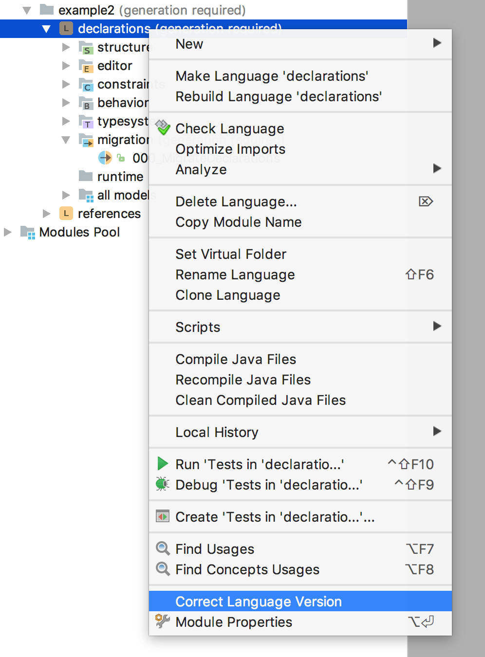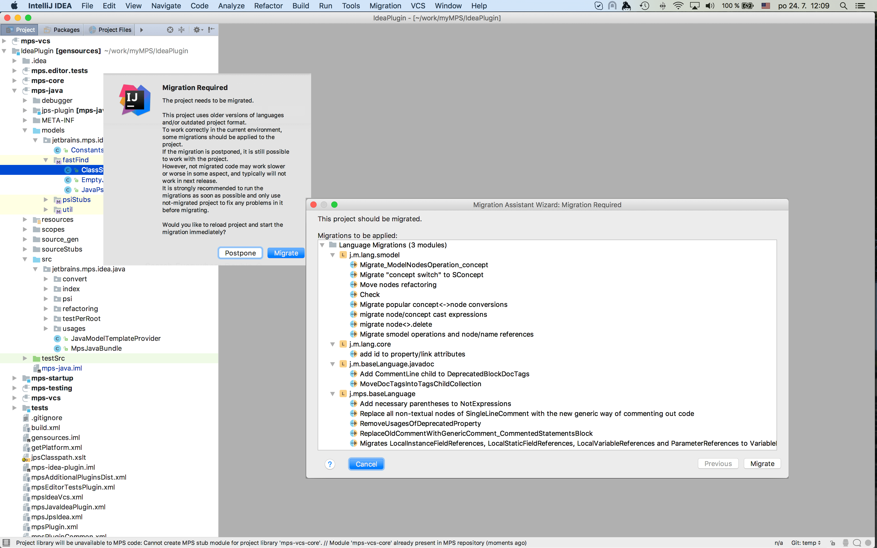 The IntelliJ IDEA plugin can also run language migrations. Just like in MPS itself, the Migration assistant will update models in IDEA projects to match the currently installed versions of used languages.