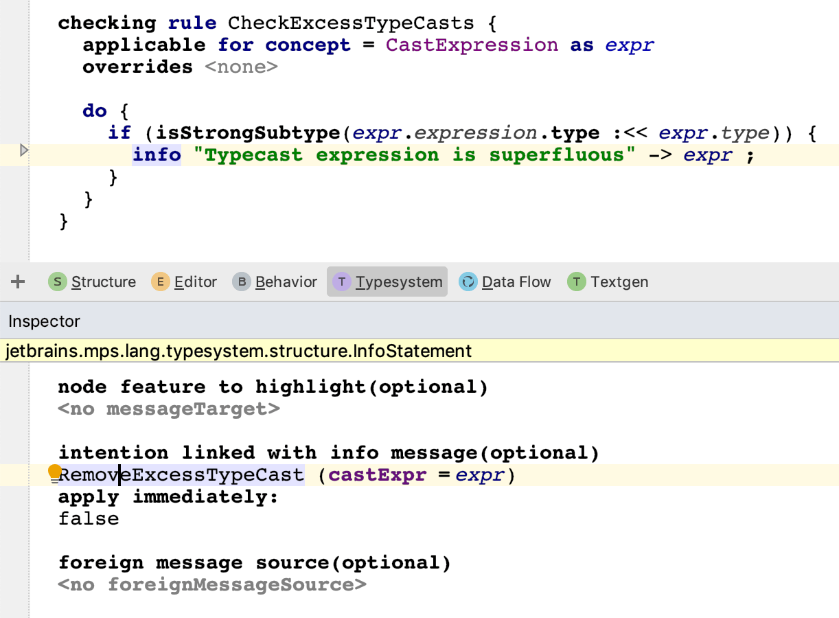 Checking rules become part of the MPS code analysis process and will report found issues to the user interactively in the editor. For example, this is a check for superfluous type casts: