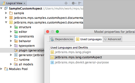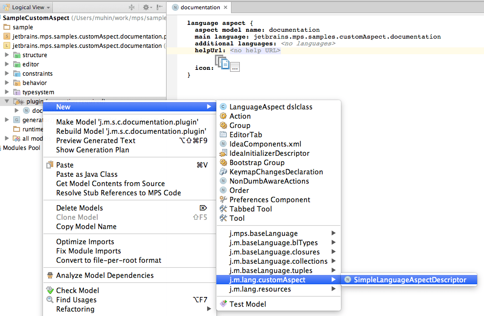 To make MPS treat some special model as a documentation aspect (that is our new custom aspect), an aspect declaration should be created in the documentation language. To do so, we create a plugin aspect in the language and import the customAspect language.